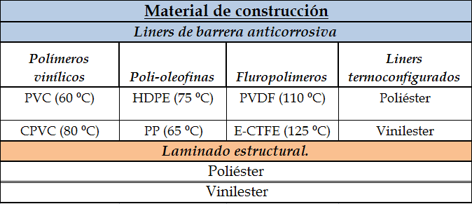 Uno de los factores que determinan la selección del liner anticorrosivo, es el tipo de líquido que se va a contener y la temperatura de almacenamiento. El cuadro siguiente ilustra los distintos tipos de materiales plásticos que pueden ser utilizados y podemos fabricar para el almacenamiento de productos químicos.